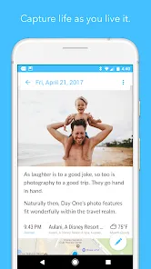 - Automatically capture and embed metadata: time, date, weather, location, step count.